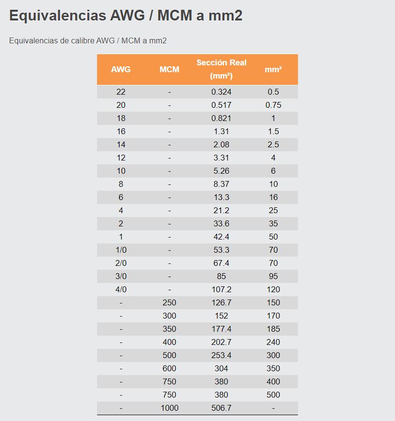 Equivalencias AWG / MCM a mm2